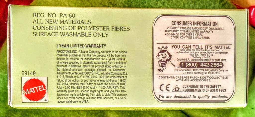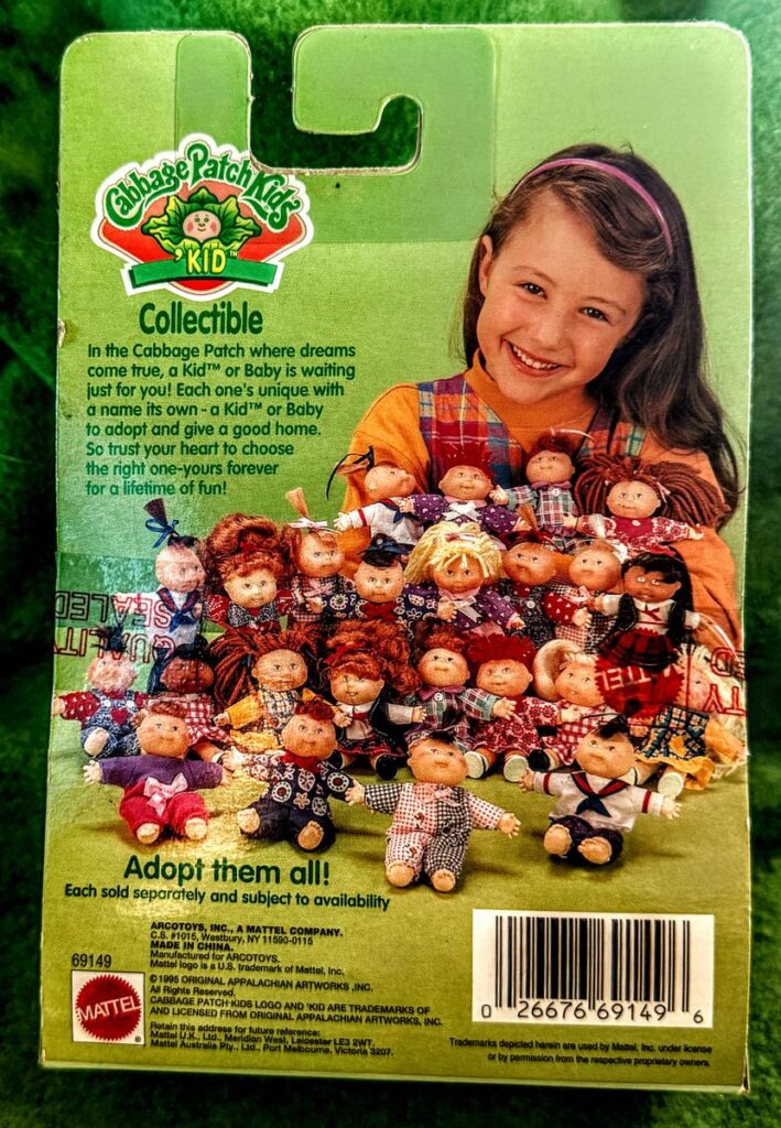 A collectible Cabbage Patch Kids doll for ages over 3 years. New old stock with original price tags from Ames, a store that went out of business many years back. Even the original Mattel seal is unbroken and in place! A collector’s dream!